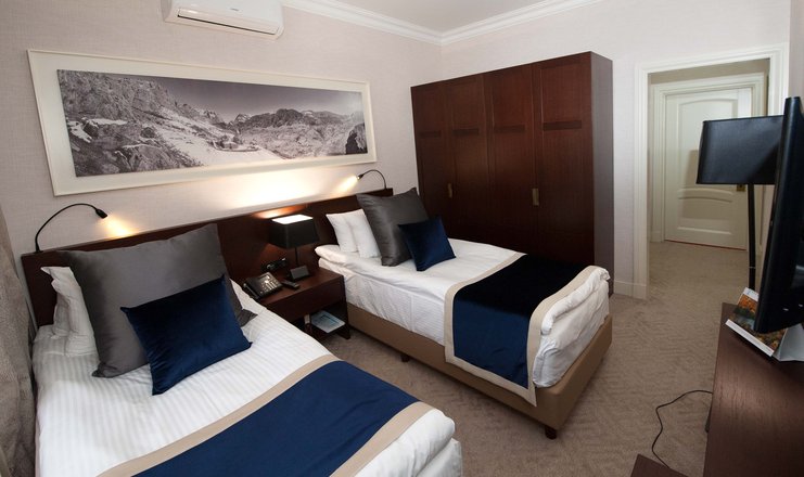 В номере: кровать двуспальная, стол, столик туалетный, стулья, гладильная доска, диван, набор посуды, сейф, сплит-система, телевизор, утюг, холодильник, электрочайник