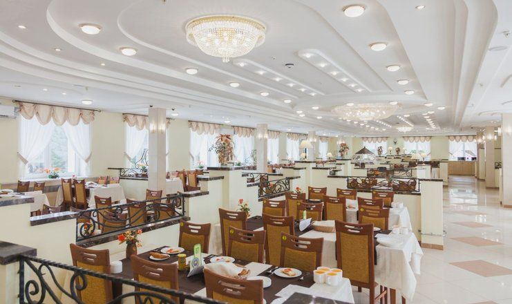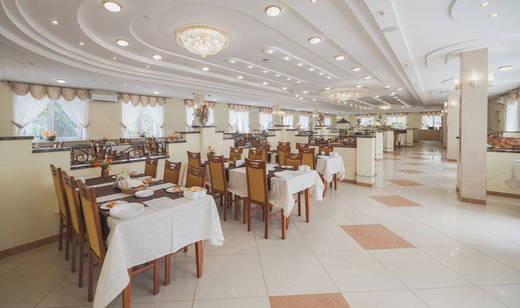 Столовая, с двумя уютными обеденными залами на 500 посадочных мест, расположена в главном корпусе санатория на втором этаже. В санатории организовано пятиразовое питание в одну смену, а для больных сахарным диабетом и лиц, нуждающихся в частом и дробном питании, предлагается дополнительный завтрак в 11:00 часов.